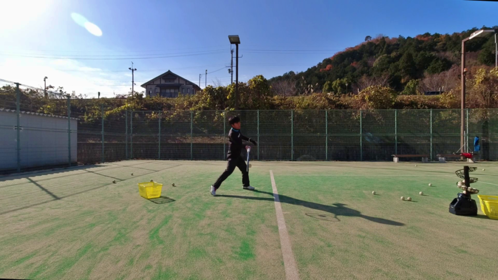 フォアハンド2カゴ、バックハンド2カゴ、レシーブ1カゴで約1時間。