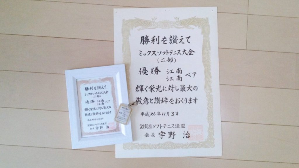 結婚して初めて出た滋賀県ミックス大会での初優勝の賞状なのでこの原本は捨てずにおいておきます(^^)