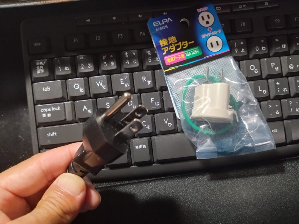 この機械は届いた箱に入ってるモノだけで立体物が作れるようになるんですが、この三叉コンセントが無良い場合、唯一この変換アダプターだけは買わないといけません。