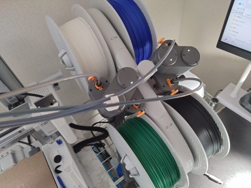 本体の横にあるこの機械(AMS)にフィラメントを設置して随時オートで色を切り替えてくれます。
