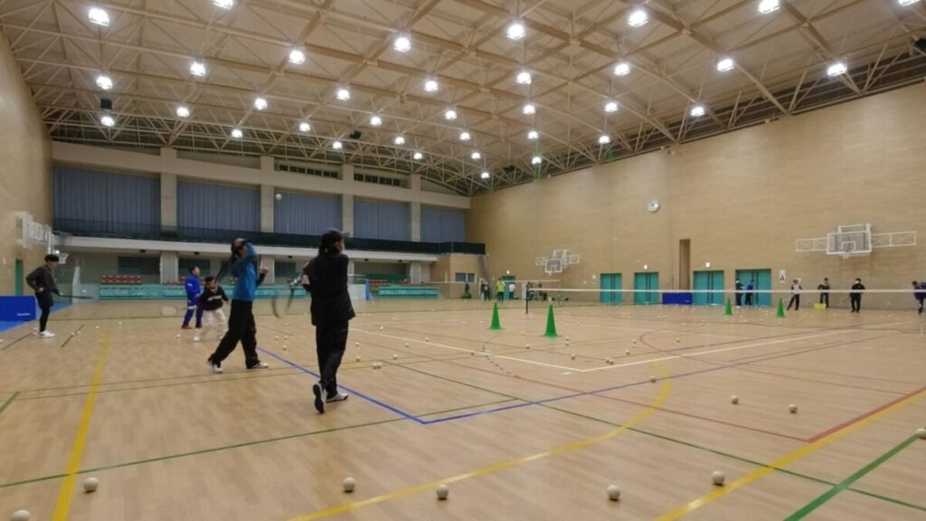 土曜日夜間の基礎練習会は中学生が多く参加してくださっています。コートが一面で参加人数も多い為、基礎練習メニューで構成しています。