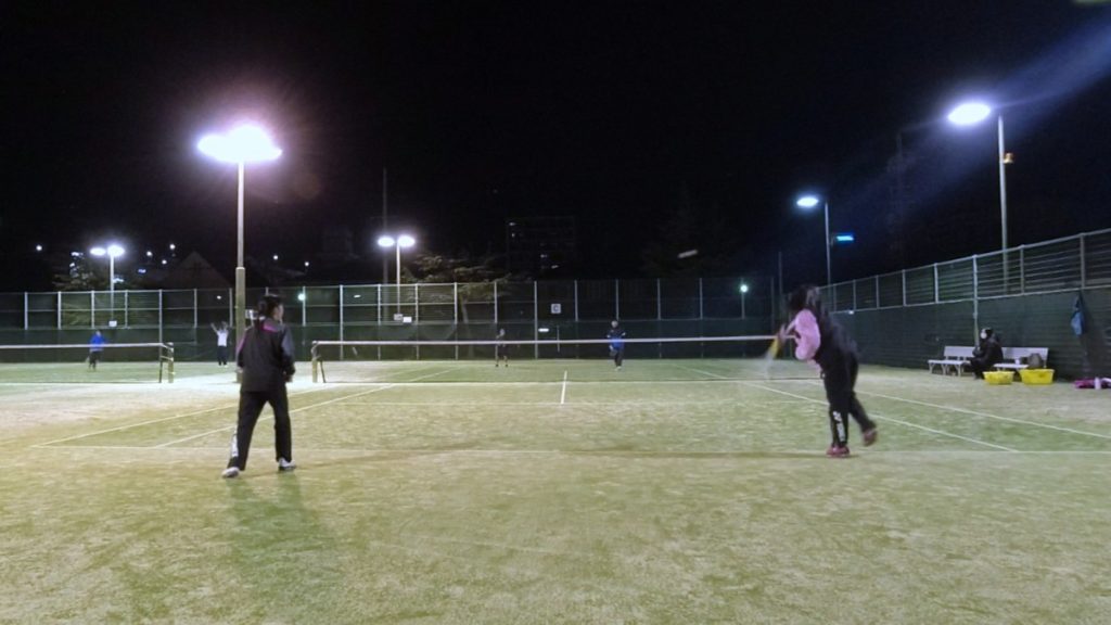月曜夜間は基礎メニューを中心に後半は試合形式などを行っています。バックハンドストロークの苦手克服にむけて沢山バックの練習を取り入れています。