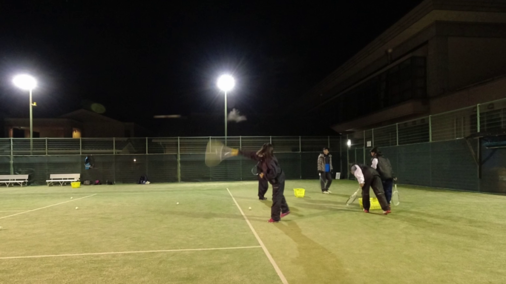 月曜夜間は基礎メニューを中心に後半は試合形式などを行っています。バックハンドストロークの苦手克服にむけて沢山バックの練習を取り入れています。