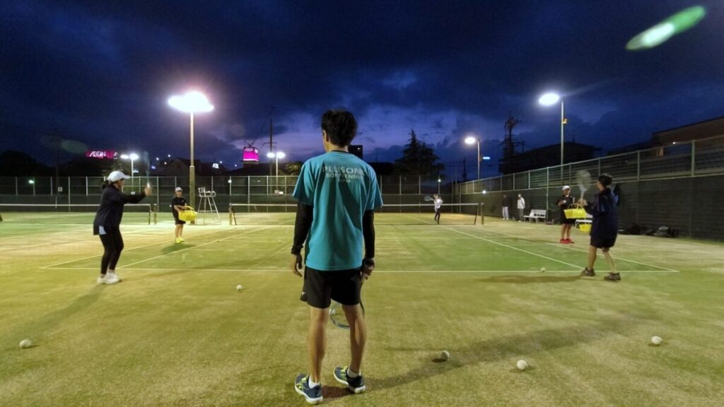 ストロークやボレーの練習をしてから、試合でよくあるシチュエーションを説明しながら試合形式をします。中学生女子が多く参加してくださっています。中学生中心ですが打てる小学生も参加可能ですのでご相談下さい。