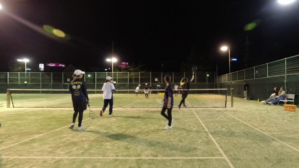 ストロークやボレーの基礎練習をしてから、試合でよくあるシチュエーションを説明しながら試合形式をします。中学生女子が多く参加してくださっています。中学生中心ですが打てる小学生も参加可能ですのでご相談下さい。