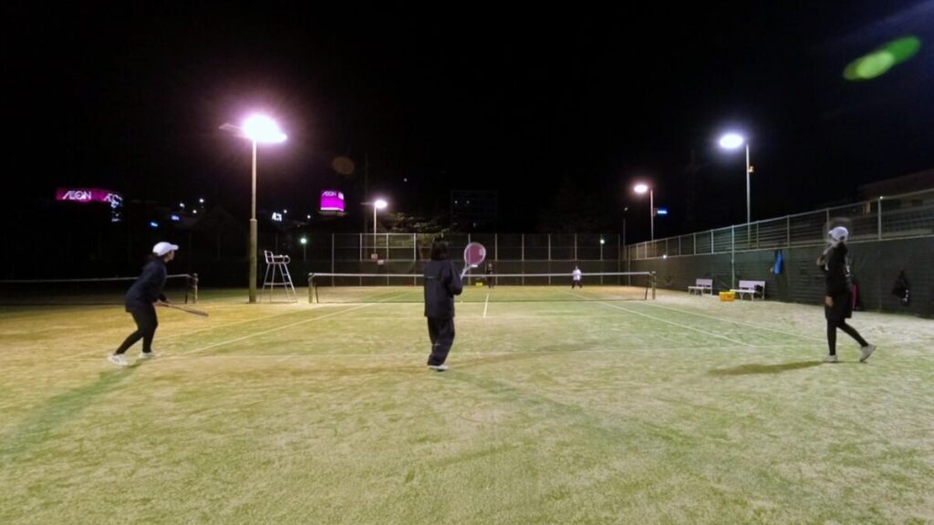 水曜しか来れない人もいるのでストロークやボレーの基礎練習をしてから、試合でよくあるシチュエーションを説明しながら応用練習をして試合形式をします。