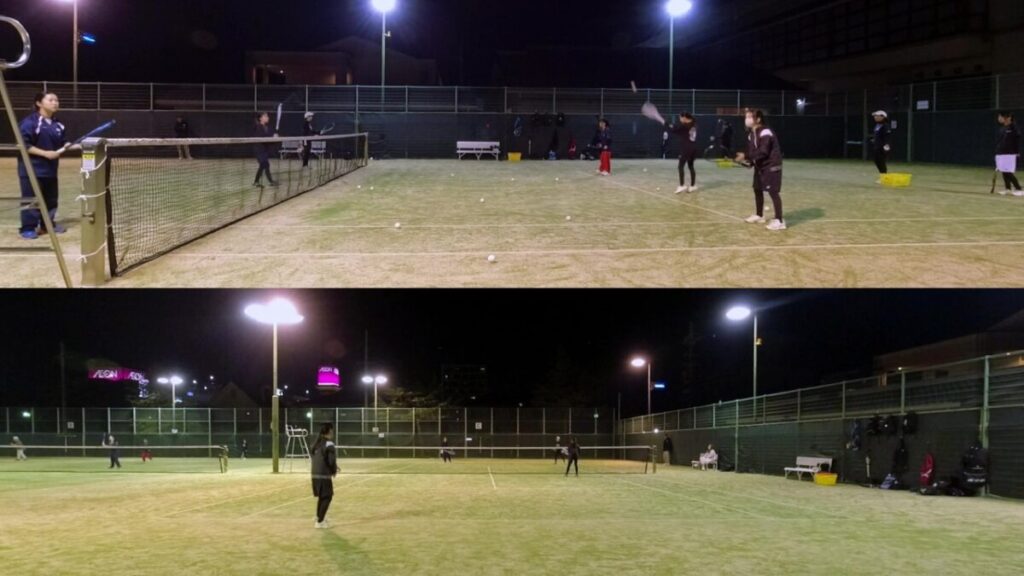 水曜しか来れない人もいるのでストロークやボレーの基礎練習をしてから、試合でよくあるシチュエーションを説明しながら応用練習をして試合形式をします。