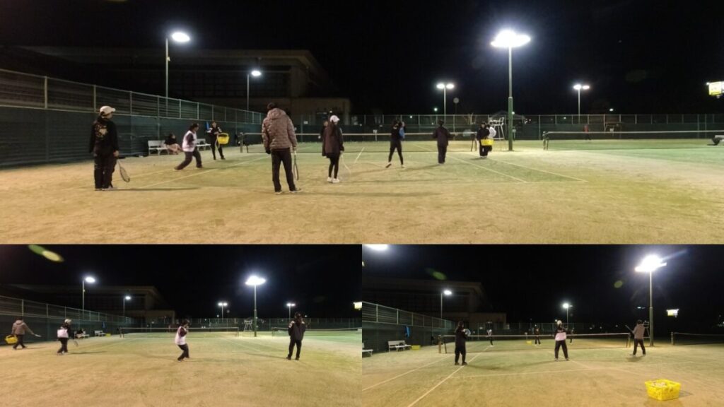 水曜しか来れない人もいるのでストロークやボレーの基礎練習をしてから、試合でよくあるシチュエーションを説明しながら応用練習をして試合形式をします。