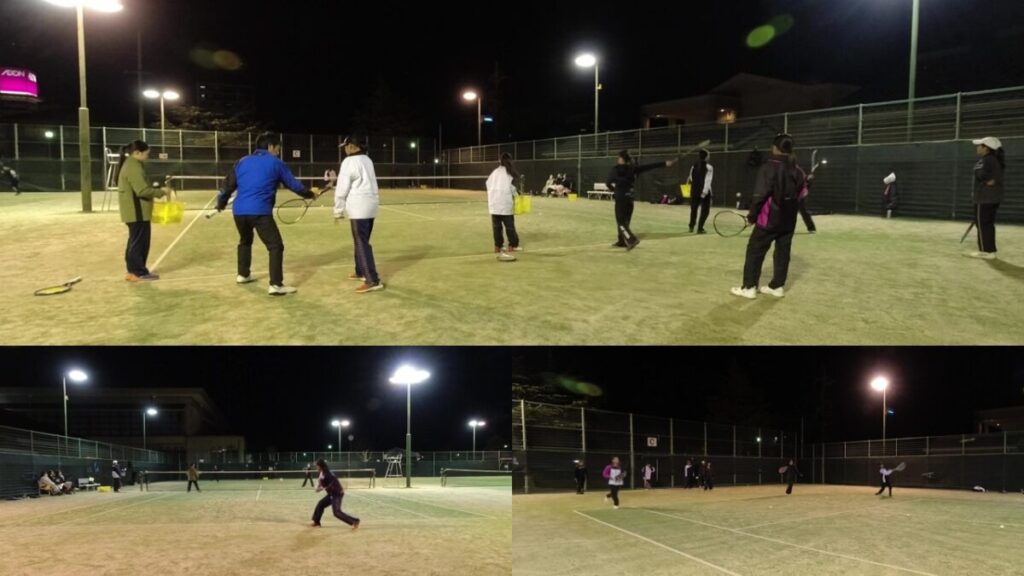 水曜しか来れない人もいるのでストロークやボレーの基礎練習をしてから、試合でよくあるシチュエーションを説明しながら応用練習をして試合形式をします。