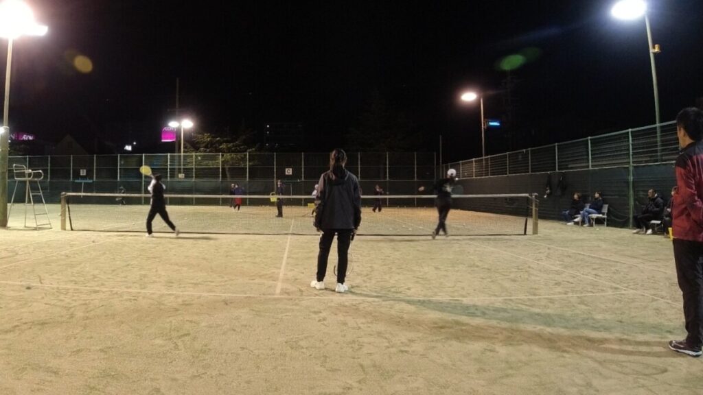 水曜しか来れない人もいるのでストロークやボレーの基礎練習をしてから、試合でよくあるシチュエーションを説明しながら応用練習をして試合形式をします。