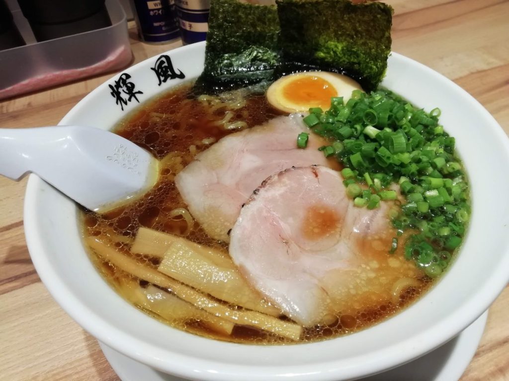 札幌ラーメン輝風の醤油ラーメン、太めのちぢれ麺、濃いめの醤油、レモン風味?のチャーシュー。